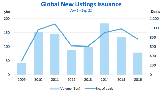 22.09.2016 Chart des Tages Kotierungsflaute. Selbst der Riesenbörsengang der chinesischen Postsparbank diese Woche mit einem Emissionsvolumen von 7,4 Mrd.