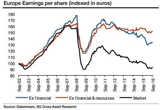 04.10.2016 Chart des Tages Miserable Gewinnaussichten für Europas Finanzsektor. Die Gewinnaussichten für europäische Unternehmen sind trostlos: So schätzen die Anlaysten von Société Générale, dass der aggregierte Gewinn pro Aktie (Earnings per Share, EPS) auf die Tiefstwerte von 2009 und 2003 fällt (schwarze Kurve).