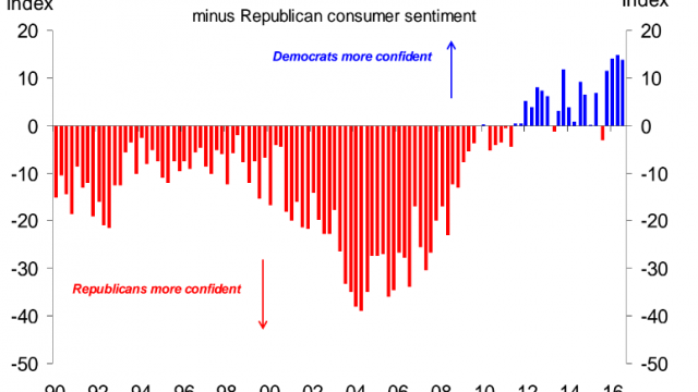 31.08.2016 Chart des Tages Die Konsumentenstimmung hängt vom Parteibuch ab. Amerika geht es schlecht, es ist ein Entwicklungsland geworden, und schuld daran sind die Chinesen, die Mexikaner und die sozialistische Politik der Obama-Regierung.