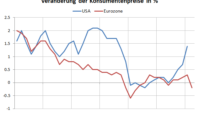 02.03.2016 Chart des Tages Deflationsangst in Europa, Inflationsdruck in den USA. In der Eurozone stemmt sich die Zentralbank mit allen Mitteln gegen ein schädliches Sinken des allgemeinen Preisniveaus.