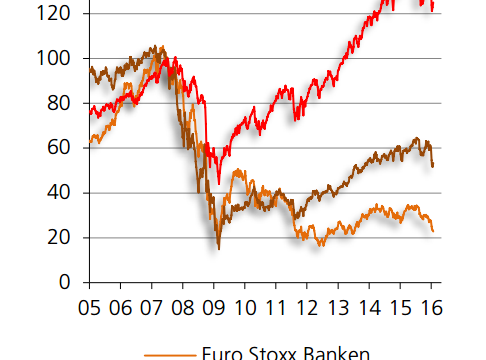 09.02.2016 Chart des Tages Bankaktien am Boden. Der Ausverkauf bei Bankvaloren setzt sich fort – hier und dort, hüben wie drüben.