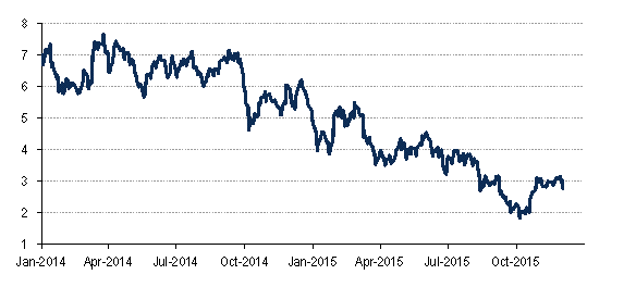 30.12.2015 Chart des Tages Ein Rezessionssignal in den USA verschärft sich. Die Zins-Terminkurve in den USA ist so flach wie seit 2012 nicht mehr.