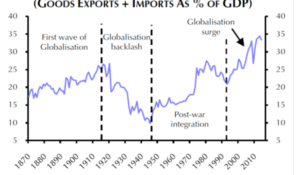20.05.2015 Chart des Tages Die Globalisierung schreitet trotz Rückschlag voran. Die Grafik zeigt die wirtschaftliche Offenheit der grössten Industrieländer seit 1870, gemessen als Summe aller Güterimporte und -exporte in Prozent des Bruttoinlandprodukts.