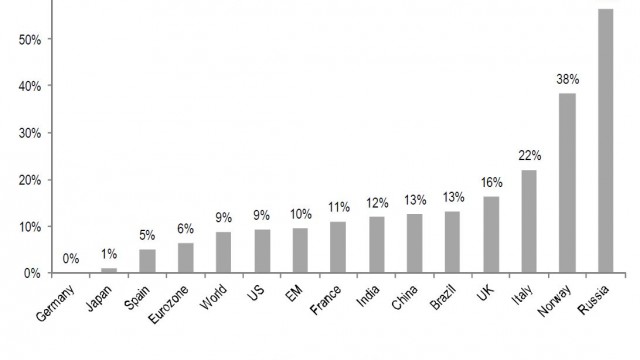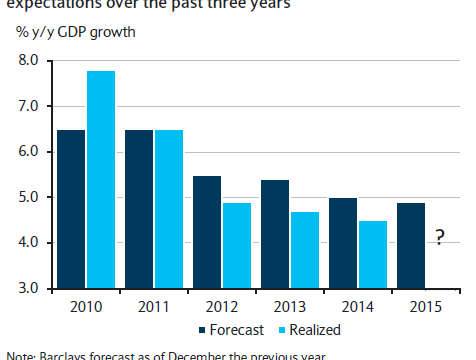 19.11.2014 Chart des Tages Die enttäuschenden Schwellenländer. Die Grafik zeigt das Wirtschaftswachstum in den Schwellenländern (hellblau) und seine Prognose (dunkelblau) der Grossbank Barclays per Ende des Vorjahres.