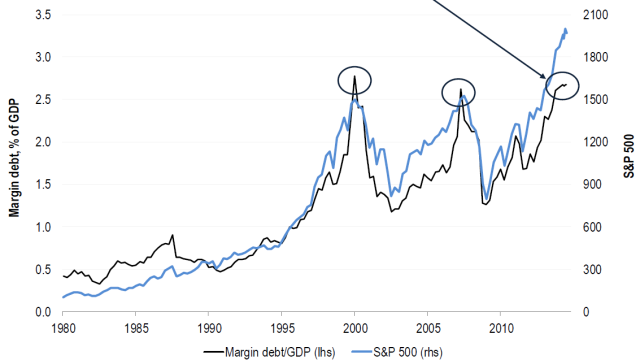 17.10.2014 Chart des Tages Die schlummernde Gefahr. Quelle: Ineichen Research & Management Die Börsenkorrektur der vergangenen Wochen rückt eine potenzielle Gefahr in Erinnerung: Am amerikanischen Aktienmarkt liegt der Einsatz von Lombardkrediten (Margin Debt) auf einem rekordhohen Niveau.