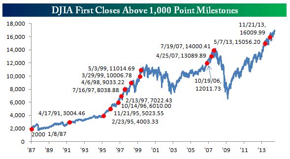 03.07.2014 Chart des Tages Der Dow knackt 17'000. Quelle: Bespoke Investment Group Am Donnerstag gleich zur Handelseröffnung in New York ist es passiert: Der Dow Jones Industrial Average ist zum ersten Mal über 17‘000 gestiegen.