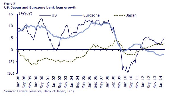 11.07.2014 Chart des Tages Das Kreditvolumen in Europa schrumpft weiter. Quelle: CLSA Asia-Pacific Markets Die Kreditvergabe der amerikanischen und der europäischen Banken liegt sechs Jahre nach Ausbruch der Finanzkrise noch immer weit unter dem Vorkrisenniveau, wie die Grafik von CLSA verdeutlicht.