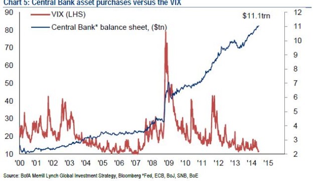 10.06.2014 Chart des Tages Trügerische Ruhe. Quelle: BoA Merrill Lynch Sorglosigkeit dominiert weiterhin die Stimmung der Investoren: Die Volatilität an den Aktienmärkten ist am Freitag auf den niedrigsten Stand seit sieben Jahren gefallen.