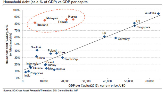 25.02.2014 Chart des Tages Haushaltsverschuldung in EmMas als Wachstumshemmer. Quelle: Société Générale In zahlreichen Schwellenländern hat sich die Verschuldung der privaten Haushalte in den vergangenen Jahren signifikant erhöht.
