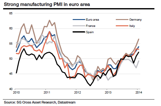 04.02.2014 Chart des Tages Europas Peripherieländer holen auf. Quelle: Société Générale Die Erholung der Industrie in Europas Peripherieländern setzte sich zum Jahresauftakt fort: Die gestern veröffentlichten endgültigen Einkaufsmanagerindizes (Purchasing Managers Index, PMI) zeigen vor allem für Italien und Spanien erfreuliche Tendenzen.