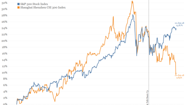 21.06.2018 Chart des Tages Ein Handelskrieg, zwei Aktienmärkte. Die Zeichen stehen auf Konfrontation: US-Präsident Donald Trump droht im Handelskonflikt mit China immer höhere Strafzölle an.