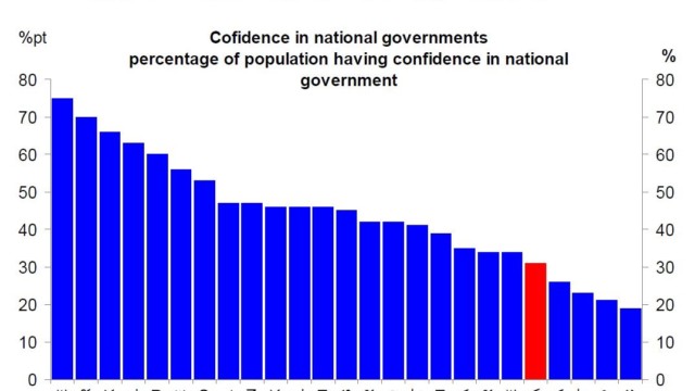 05.06.2018 Chart des Tages Vertrauenskrise in Italien. Die Italiener trauen der eigenen Regierung nicht über den Weg: Nur 30% der Bevölkerung haben Vertrauen in die politische Führung, zeigt eine Erhebung der OECD (vgl.