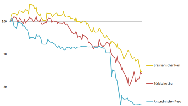 08.06.2018 Chart des Tages Domino in den Schwellenländern. Die höheren Zinsen in den USA und der sich wieder aufwertende Dollar bringen die Schwellenländer in Bedrängnis.