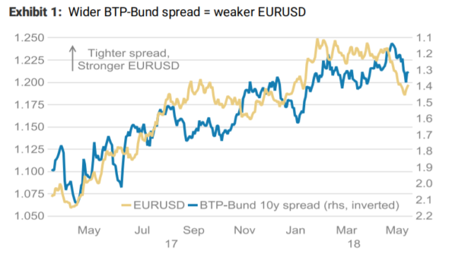 14.05.2018 Chart des Tages Italiens Experiment und der Euro. Auf ihn werden sich in den kommenden Monaten die Blicke der Devisenhändler richten: den Renditeaufschlag italienischer gegenüber deutschen Staatsanleihen.