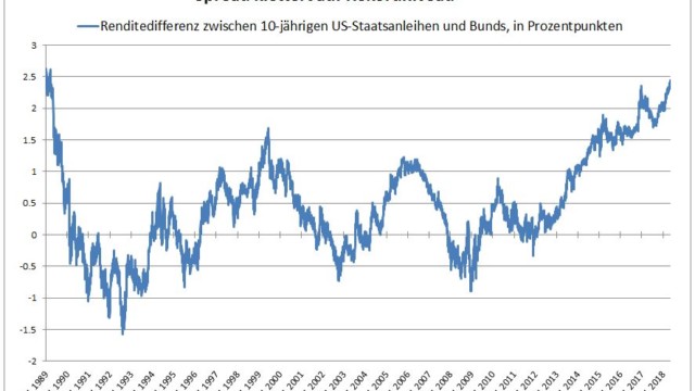 15.05.2018 Chart des Tages Die Kluft zwischen den USA und Europa wächst. Wer in zehnjährige amerikanische Staatsanleihen investiert, erhält derzeit eine Rendite von knapp über 3%.