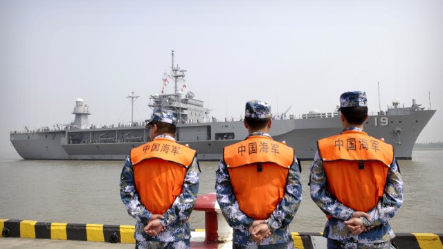 07.06.2016 Objektiv Besuch Die USS Blue Ridge läuft ein in den Hafen von Schanghai, wachsam beäugt von Volksbefreiungsarmisten.