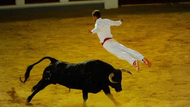 08.12.2015 Objektiv Überflieger Einer flog über den Stier – hier ein auf solche Mutproben spezialisierter Torero, ein «Recortador» in der Arena von Valladolid.