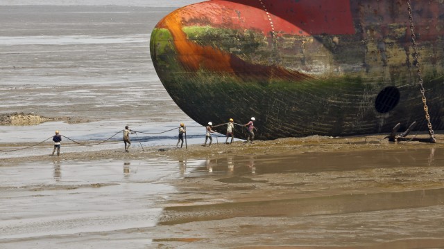21.04.2015 Objektiv Schiffbruch Wie ein gestrandeter Wal liegt der ausgemusterte Hochseefrachter an der Küste Gujarats.