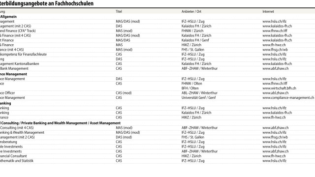 25.11.2016 Galerien Bildungsangebote im Überblick Auch in der Finanzwelt ist der Wind rauer geworden. Veränderungen verlangen nach Flexibilität und Aus- und Weiterbildung auf allen Stufen. Bildungsinstitute sind mit einer Vielfalt von Programmen zur Stelle.
