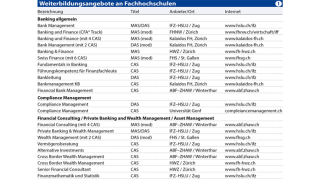 27.11.2014 Galerien Bildungsangebote im Überblick Schweizer Bildungsinstitute halten mit der raschen Entwicklung und dem Umbruch im Finanzbereich Schritt. Das zeigt allein der Blick aufs immer grösser werdende Angebot.